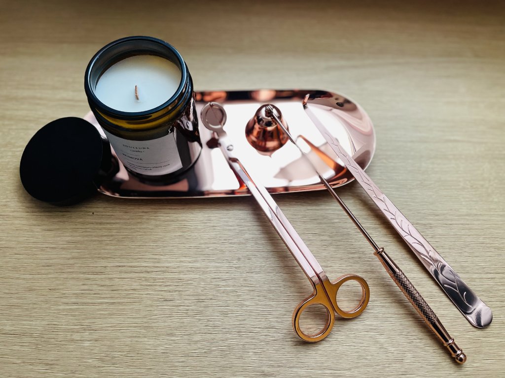 (obsahuje: podtácek, nůžky na krácení knotu, rovnátko knotu a zhášecí zvonek nebo kužel - dle výběru)